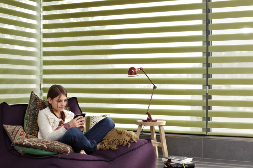 Cortina doble día y noche con franjas opacas y translúcidas.
