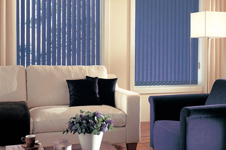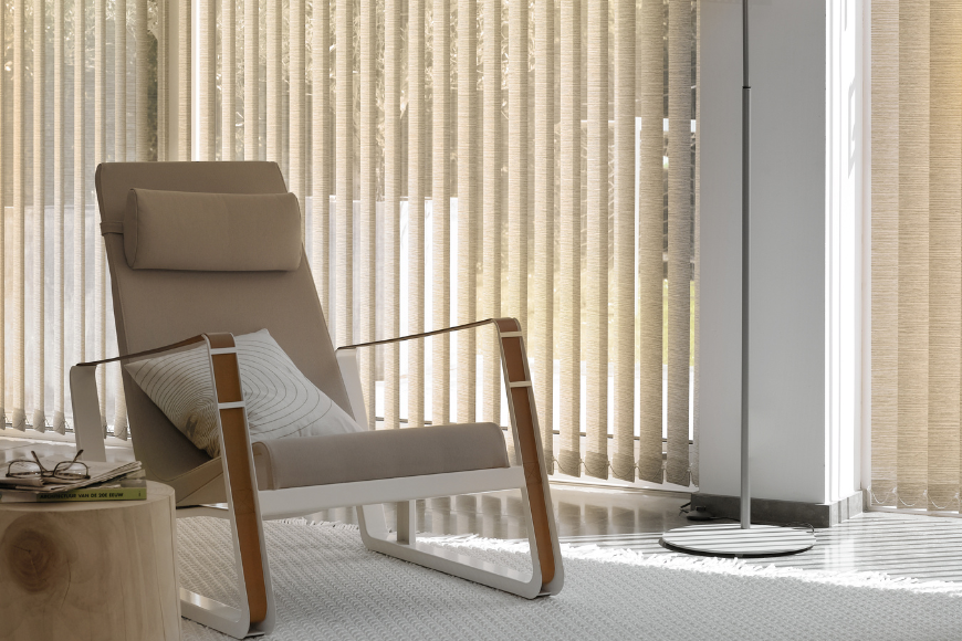 Cortina de láminas verticales giratorias para grandes ventanales.
